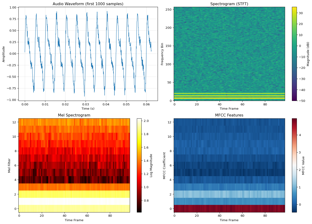 Digital Audio Fundamentals: Sound is captured by sampling continuous pressure waves at regular intervals. The sample rate (typically 16 kHz for speech) determines the maximum frequency we can capture via the Nyquist theorem - we need to sample at least 2Γ the highest frequency of interest. One second of 16 kHz audio contains 16,000 numerical samples representing amplitude variations over time.