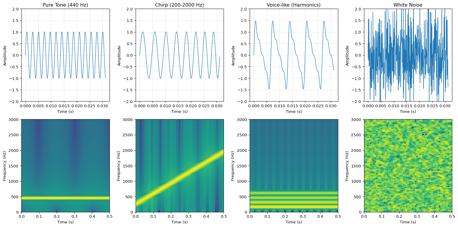 import numpy as npimport matplotlib.pyplot as plt# Create different types of audio signalsnp.random.seed(42)sample_rate =16000duration =0.5t = np.linspace(0, duration, int(sample_rate * duration))# Signal 1: Pure tone (single frequency)freq1 =440# A4 notesignal1 = np.sin(2* np.pi * freq1 * t)# Signal 2: Chirp (frequency sweep)freq_start =200freq_end =2000chirp = np.sin(2* np.pi * (freq_start * t + (freq_end - freq_start) * t**2/ (2* duration)))# Signal 3: Voice-like (multiple harmonics)fundamental =150voice = (np.sin(2* np.pi * fundamental * t) +0.5* np.sin(2* np.pi *2* fundamental * t) +0.3* np.sin(2* np.pi *3* fundamental * t) +0.2* np.sin(2* np.pi *4* fundamental * t))# Signal 4: Noisenoise = np.random.randn(len(t))signals = {'Pure Tone (440 Hz)': signal1,'Chirp (200-2000 Hz)': chirp,'Voice-like (Harmonics)': voice,'White Noise': noise}# Compute spectrogramsdef simple_spectrogram(signal, sample_rate, n_fft=512, hop_length=128):"""Compute spectrogram using STFT""" frame_length = n_fft num_frames =1+ (len(signal) - frame_length) // hop_length spec = np.zeros((n_fft //2+1, num_frames))for i inrange(num_frames): start = i * hop_length frame = signal[start:start + frame_length]iflen(frame) < frame_length: frame = np.pad(frame, (0, frame_length -len(frame))) window = np.hamming(frame_length) windowed = frame * window spectrum = np.fft.rfft(windowed) spec[:, i] = np.abs(spectrum)return20* np.log10(spec +1e-10) # Convert to dB# Create visualizationfig, axes = plt.subplots(2, 4, figsize=(16, 8))for idx, (name, signal) inenumerate(signals.items()):# Waveform ax_wave = axes[0, idx] ax_wave.plot(t[:500], signal[:500], linewidth=1) ax_wave.set_title(name) ax_wave.set_xlabel('Time (s)') ax_wave.set_ylabel('Amplitude') ax_wave.grid(True, alpha=0.3) ax_wave.set_ylim(-2, 2)# Spectrogram ax_spec = axes[1, idx] spec = simple_spectrogram(signal, sample_rate) im = ax_spec.imshow(spec, aspect='auto', origin='lower', cmap='viridis', extent=[0, duration, 0, sample_rate/2]) ax_spec.set_xlabel('Time (s)') ax_spec.set_ylabel('Frequency (Hz)') ax_spec.set_ylim(0, 3000) # Focus on speech rangeplt.tight_layout()plt.show()print("SPECTROGRAM ANALYSIS")print("="*60)print("\nSignal Characteristics:")print(f" Pure Tone: Single horizontal line at 440 Hz")print(f" Chirp: Diagonal line from 200 to 2000 Hz")print(f" Voice-like: Multiple horizontal lines (harmonics)")print(f" White Noise: Energy spread across all frequencies")print(f"\nKey insight: Spectrograms reveal frequency content over time!")print(f"Different sound types have distinctive patterns.")