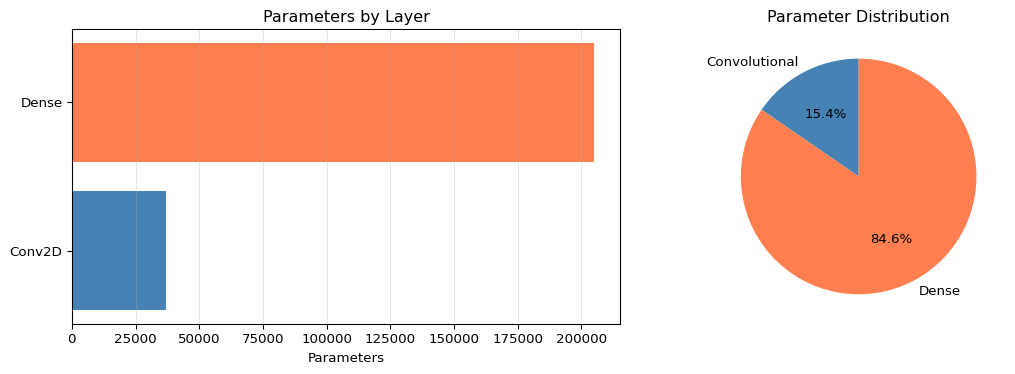 def count_conv2d_params(input_channels, output_filters, kernel_size, use_bias=True):"""Calculate parameters in a Conv2D layer.""" weights = kernel_size * kernel_size * input_channels * output_filters biases = output_filters if use_bias else0return weights + biasesdef count_dense_params(input_size, output_size, use_bias=True):"""Calculate parameters in a Dense layer.""" weights = input_size * output_size biases = output_size if use_bias else0return weights + biases# Analyze Fashion MNIST CNN architectureprint("=== Fashion MNIST CNN Parameter Breakdown ===\n")layers = [ ("Conv2D(64, 3x3, in=1)", count_conv2d_params(1, 64, 3)), ("MaxPooling2D", 0), ("Conv2D(64, 3x3, in=64)", count_conv2d_params(64, 64, 3)), ("MaxPooling2D", 0), ("Flatten", 0), ("Dense(5*5*64 -> 128)", count_dense_params(5*5*64, 128)), ("Dense(128 -> 10)", count_dense_params(128, 10))]total =sum(params for _, params in layers)for layer_name, params in layers: pct = (params / total *100) if total >0else0print(f"{layer_name:30s}: {params:7,d} params ({pct:5.1f}%)")print(f"\n{'Total':30s}: {total:7,d} params")print(f"\nMemory Requirements:")print(f" Float32: {total *4/1024:.1f} KB")print(f" Int8 (quantized): {total /1024:.1f} KB")conv_params = layers[0][1] + layers[2][1]dense_params = layers[5][1] + layers[6][1]print(f"\nParameter Distribution:")print(f" Convolutional layers: {conv_params:,d} ({conv_params/total*100:.1f}%)")print(f" Dense layers: {dense_params:,d} ({dense_params/total*100:.1f}%)")print(f" --> Dense layers dominate! Minimize these for edge deployment.")# Visualize parameter distributionimport matplotlib.pyplot as pltfig, (ax1, ax2) = plt.subplots(1, 2, figsize=(12, 4))# Bar chart of layer parameterslayer_names = [name.split('(')[0] for name, _ in layers if _ >0]layer_params = [params for _, params in layers if params >0]ax1.barh(layer_names, layer_params, color=['steelblue', 'steelblue', 'coral', 'coral'])ax1.set_xlabel('Parameters')ax1.set_title('Parameters by Layer')ax1.grid(axis='x', alpha=0.3)# Pie chart of conv vs denseax2.pie([conv_params, dense_params], labels=['Convolutional', 'Dense'], autopct='%1.1f%%', colors=['steelblue', 'coral'], startangle=90)ax2.set_title('Parameter Distribution')plt.tight_layout()plt.show()