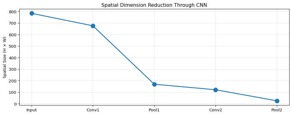 def conv_output_size(input_size, kernel_size, padding=0, stride=1):""" Calculate output size for convolution or pooling layer. Formula: output_size = floor((input_size - kernel_size + 2*padding) / stride) + 1 Args: input_size: Height or width of input (int) kernel_size: Size of kernel/filter (int) padding: Number of pixels padded on each side (int) stride: Step size for sliding window (int) Returns: Output dimension (int) """return ((input_size - kernel_size +2* padding) // stride) +1def calculate_cnn_dimensions(input_shape, architecture):""" Track spatial dimensions through a CNN architecture. Args: input_shape: Tuple (height, width, channels) architecture: List of layer dicts with 'type', 'kernel', 'stride', 'padding', 'filters' Returns: List of output shapes at each layer """ h, w, c = input_shape shapes = [input_shape]for layer in architecture:if layer['type'] in ['conv', 'pool']: h = conv_output_size(h, layer['kernel'], layer.get('padding', 0), layer.get('stride', 1)) w = conv_output_size(w, layer['kernel'], layer.get('padding', 0), layer.get('stride', 1))if layer['type'] =='conv': c = layer['filters'] # Conv changes number of channels# Pooling keeps same number of channels shapes.append((h, w, c))return shapes# Example: Fashion MNIST CNNinput_shape = (28, 28, 1)architecture = [ {'type': 'conv', 'kernel': 3, 'stride': 1, 'padding': 0, 'filters': 64}, {'type': 'pool', 'kernel': 2, 'stride': 2, 'padding': 0}, {'type': 'conv', 'kernel': 3, 'stride': 1, 'padding': 0, 'filters': 64}, {'type': 'pool', 'kernel': 2, 'stride': 2, 'padding': 0}]shapes = calculate_cnn_dimensions(input_shape, architecture)print("CNN Dimension Flow:")print(f"Input: {shapes[0]}")print(f"After Conv2D(64,3): {shapes[1]}")print(f"After MaxPool(2,2): {shapes[2]}")print(f"After Conv2D(64,3): {shapes[3]}")print(f"After MaxPool(2,2): {shapes[4]}")# Quick reference examplesprint("\n--- Common Scenarios ---")print(f"28×28 image, 3×3 conv (no padding): {conv_output_size(28, 3, 0, 1)}×{conv_output_size(28, 3, 0, 1)}")print(f"28×28 image, 3×3 conv (same padding): {conv_output_size(28, 3, 1, 1)}×{conv_output_size(28, 3, 1, 1)}")print(f"26×26 image, 2×2 maxpool: {conv_output_size(26, 2, 0, 2)}×{conv_output_size(26, 2, 0, 2)}")print(f"224×224 image, 7×7 conv, stride=2: {conv_output_size(224, 7, 3, 2)}×{conv_output_size(224, 7, 3, 2)}")