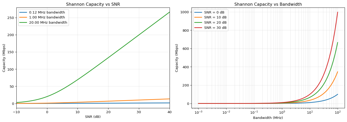 import numpy as npimport matplotlib.pyplot as pltdef shannon_capacity_bps(bandwidth_hz, snr_db):""" Calculate Shannon channel capacity in bits per second. Shannon-Hartley theorem: C = B × log2(1 + SNR) Args: bandwidth_hz: Channel bandwidth in Hz snr_db: Signal-to-Noise Ratio in dB Returns: Capacity in bits per second """ snr_linear =10** (snr_db /10) capacity = bandwidth_hz * np.log2(1+ snr_linear)return capacitydef db_to_linear(db):"""Convert dB to linear scale."""return10** (db /10)def linear_to_db(linear):"""Convert linear to dB scale."""return10* np.log10(linear)# Calculate capacity for different wireless technologiestechnologies = [ ("WiFi 2.4GHz (802.11n)", 20e6, 25), # 20 MHz bandwidth, 25 dB SNR ("Bluetooth Low Energy", 1e6, 15), # 1 MHz bandwidth, 15 dB SNR ("LoRa (SF7)", 125e3, 7), # 125 kHz bandwidth, 7 dB SNR ("Zigbee", 2e6, 20), # 2 MHz bandwidth, 20 dB SNR ("4G LTE", 20e6, 30), # 20 MHz bandwidth, 30 dB SNR]print("=== Shannon Capacity for Wireless Technologies ===\n")for name, bw, snr in technologies: capacity_bps = shannon_capacity_bps(bw, snr) capacity_mbps = capacity_bps /1e6print(f"{name:30s}")print(f" Bandwidth: {bw/1e6:.2f} MHz")print(f" SNR: {snr} dB (linear: {db_to_linear(snr):.1f})")print(f" Max capacity: {capacity_mbps:.2f} Mbps ({capacity_bps/1e3:.1f} kbps)")print()# Visualize: SNR vs Capacity for fixed bandwidthsnr_range_db = np.linspace(-10, 40, 100)bandwidths = [125e3, 1e6, 20e6] # LoRa, BLE, WiFifig, (ax1, ax2) = plt.subplots(1, 2, figsize=(14, 5))# Plot 1: Capacity vs SNRfor bw in bandwidths: capacities = [shannon_capacity_bps(bw, snr) /1e6for snr in snr_range_db] ax1.plot(snr_range_db, capacities, linewidth=2, label=f'{bw/1e6:.2f} MHz bandwidth')ax1.set_xlabel('SNR (dB)')ax1.set_ylabel('Capacity (Mbps)')ax1.set_title('Shannon Capacity vs SNR')ax1.legend()ax1.grid(alpha=0.3)ax1.set_xlim(-10, 40)# Plot 2: Capacity vs Bandwidthbandwidth_range = np.logspace(3, 8, 100) # 1 kHz to 100 MHzsnr_values = [0, 10, 20, 30]for snr in snr_values: capacities = [shannon_capacity_bps(bw, snr) /1e6for bw in bandwidth_range] ax2.plot(bandwidth_range /1e6, capacities, linewidth=2, label=f'SNR = {snr} dB')ax2.set_xlabel('Bandwidth (MHz)')ax2.set_ylabel('Capacity (Mbps)')ax2.set_title('Shannon Capacity vs Bandwidth')ax2.set_xscale('log')ax2.legend()ax2.grid(alpha=0.3, which='both')plt.tight_layout()plt.show()# Practical example: IoT sensor data requirementsprint("\n=== IoT Sensor Data Rate Requirements ===\n")sensors = [ ("Temperature (JSON)", 50, 1), # 50 bytes, 1 Hz ("Accelerometer (raw)", 12, 50), # 12 bytes, 50 Hz ("Audio (16kHz, 16-bit)", 32000, 1), # 32 kB/s ("Camera (VGA, JPEG)", 10000, 10), # 10 kB per frame, 10 fps]for name, bytes_per_sample, rate_hz in sensors: data_rate_bps = bytes_per_sample *8* rate_hz data_rate_kbps = data_rate_bps /1000print(f"{name:30s}: {data_rate_kbps:8.1f} kbps")# Check feasibility for BLE (1 Mbps theoretical) ble_capacity = shannon_capacity_bps(1e6, 15) /1e3# kbps feasible = data_rate_kbps < ble_capacity *0.5# Use 50% marginprint(f" BLE feasible: {'Yes'if feasible else'No'} (BLE capacity: {ble_capacity:.0f} kbps)")print()