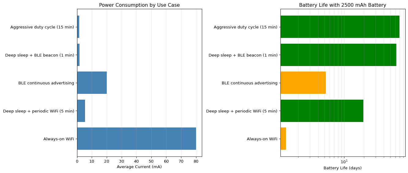 import numpy as npimport matplotlib.pyplot as pltclass PowerProfile:"""Power consumption profile for ESP32."""# Current draw in different states (mA) DEEP_SLEEP =0.01 LIGHT_SLEEP =0.8 CPU_ACTIVE =30 WIFI_CONNECTED =80 WIFI_TX =160 BLE_ADVERTISING =20 BLE_CONNECTED =40def calculate_average_current(activities, durations_sec):""" Calculate average current for a duty cycle. Args: activities: List of (current_mA, name) tuples durations_sec: List of durations in seconds Returns: Average current in mA """ total_time =sum(durations_sec) energy_sum =sum(current * duration for (current, _), durationinzip(activities, durations_sec)) avg_current = energy_sum / total_timereturn avg_currentdef battery_life_hours(battery_capacity_mah, avg_current_ma):"""Calculate battery life in hours."""return battery_capacity_mah / avg_current_ma# Define common use casesuse_cases = {"Always-on WiFi": {"activities": [ (PowerProfile.WIFI_CONNECTED, "WiFi idle"), ],"durations": [1.0] # Continuous },"Deep sleep + periodic WiFi (5 min)": {"activities": [ (PowerProfile.WIFI_TX, "WiFi transmit"), (PowerProfile.DEEP_SLEEP, "Deep sleep") ],"durations": [10, 290] # 10s active, 290s sleep (5 min cycle) },"BLE continuous advertising": {"activities": [ (PowerProfile.BLE_ADVERTISING, "BLE advertising"), ],"durations": [1.0] },"Deep sleep + BLE beacon (1 min)": {"activities": [ (PowerProfile.BLE_ADVERTISING, "BLE advertising"), (PowerProfile.DEEP_SLEEP, "Deep sleep") ],"durations": [5, 55] # 5s advertising, 55s sleep },"Aggressive duty cycle (15 min)": {"activities": [ (PowerProfile.CPU_ACTIVE, "Wake up"), (PowerProfile.WIFI_TX, "WiFi transmit"), (PowerProfile.DEEP_SLEEP, "Deep sleep") ],"durations": [2, 8, 890] # 2s CPU, 8s WiFi, 890s sleep (15 min) }}# Battery capacities for common batteriesbatteries = {"CR2032 coin cell": 225,"18650 Li-ion": 2500,"AAA alkaline": 1000,"USB power bank": 10000}# Calculate and display resultsprint("=== ESP32 Battery Life Estimation ===\n")results = {}for use_case_name, config in use_cases.items(): avg_current = calculate_average_current(config['activities'], config['durations']) results[use_case_name] = avg_currentprint(f"{use_case_name}:")print(f" Average current: {avg_current:.2f} mA")for battery_name, capacity_mah in batteries.items(): life_hours = battery_life_hours(capacity_mah, avg_current) life_days = life_hours /24if life_hours <1: life_str =f"{life_hours *60:.0f} minutes"elif life_days <1: life_str =f"{life_hours:.1f} hours"else: life_str =f"{life_days:.1f} days"print(f" {battery_name:20s}: {life_str}")print()# Visualize battery life comparisonfig, (ax1, ax2) = plt.subplots(1, 2, figsize=(14, 6))# Plot 1: Average current by use caseuse_case_names =list(results.keys())currents = [results[name] for name in use_case_names]ax1.barh(use_case_names, currents, color='steelblue')ax1.set_xlabel('Average Current (mA)')ax1.set_title('Power Consumption by Use Case')ax1.grid(axis='x', alpha=0.3)# Plot 2: Battery life for 2500 mAh batterybattery_capacity =2500# 18650 Li-ionlife_days = [battery_life_hours(battery_capacity, curr) /24for curr in currents]colors = ['red'if days <1else'orange'if days <7else'green'for days in life_days]ax2.barh(use_case_names, life_days, color=colors)ax2.set_xlabel('Battery Life (days)')ax2.set_title(f'Battery Life with {battery_capacity} mAh Battery')ax2.set_xscale('log')ax2.grid(axis='x', alpha=0.3, which='both')plt.tight_layout()plt.show()# Optimization recommendationsprint("\n=== Power Optimization Strategies ===\n")optimizations = [ ("Use deep sleep between readings", "100x power reduction (80 mA → 0.01 mA)"), ("Increase sleep interval (1 min → 5 min)", "5x battery life improvement"), ("Use BLE instead of WiFi for low-rate data", "4-8x power reduction"), ("Reduce WiFi TX power (WiFi.setTxPower)", "10-20% power reduction"), ("Buffer data, batch transmissions", "Minimize wake-up frequency"), ("Use light sleep for fast wake-up needs", "Maintains connection but 100x savings vs active"),]for strategy, benefit in optimizations:print(f"- {strategy}")print(f" Benefit: {benefit}\n")