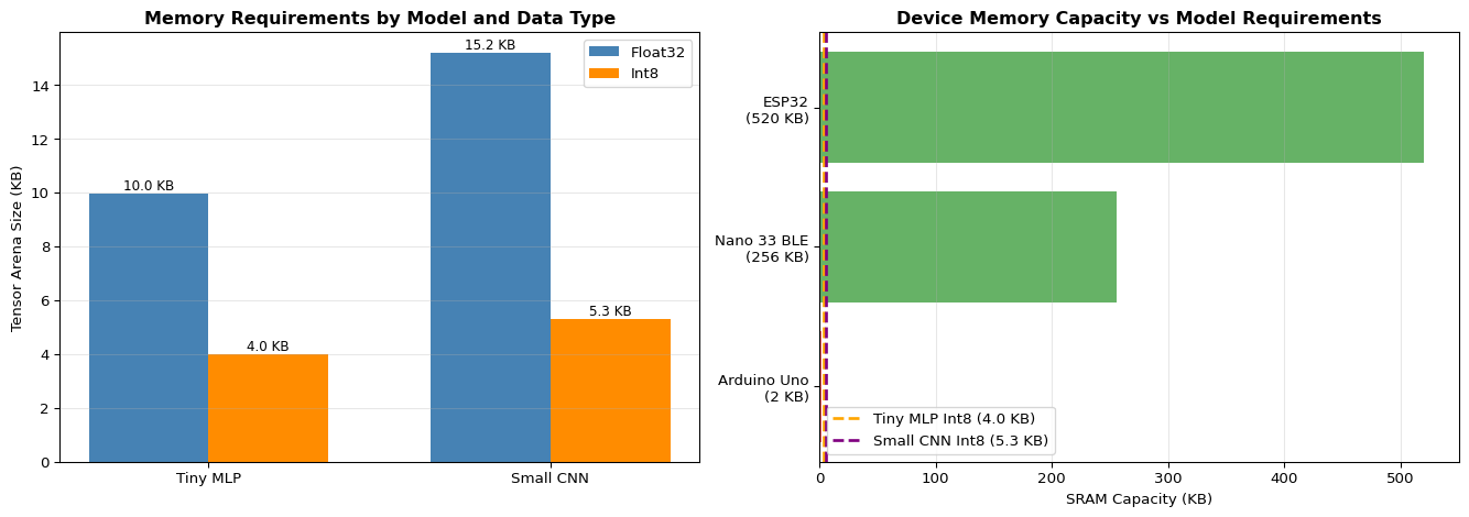 Estimate model file size and tensor arena needs (Float32 vs Int8).
