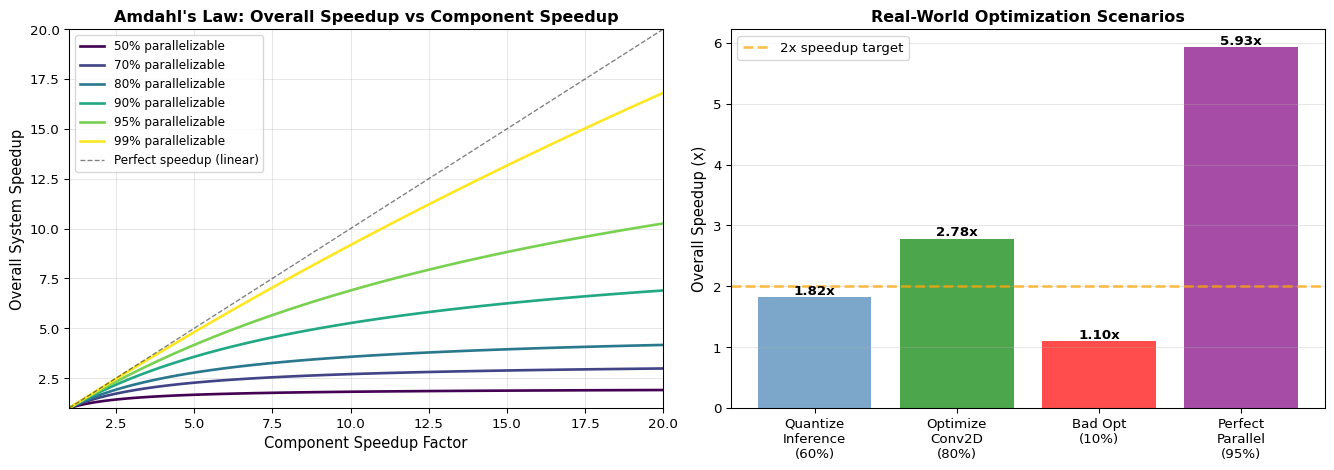 import numpy as npimport matplotlib.pyplot as pltdef amdahls_law(parallel_fraction, speedup_factor):""" Calculate theoretical speedup using Amdahl's Law Overall speedup = 1 / ((1 - P) + P/S) where P = fraction that can be parallelized/optimized S = speedup factor for that fraction """if parallel_fraction <0or parallel_fraction >1:raiseValueError("Parallel fraction must be between 0 and 1") serial_fraction =1- parallel_fraction speedup =1/ (serial_fraction + parallel_fraction / speedup_factor)return speedup# Example scenariosprint("="*70)print("Amdahl's Law: Optimization Scenarios")print("="*70)scenarios = [ {'name': 'Quantize inference (60% of time in MatMul)','parallel_fraction': 0.60,'speedup_factor': 4.0, # Int8 vs Float32'description': '60% of inference time is matrix multiplication, 4x faster with Int8' }, {'name': 'Optimize convolution (80% of time in Conv2D)','parallel_fraction': 0.80,'speedup_factor': 5.0, # CMSIS-NN optimization'description': '80% of inference time in Conv2D, 5x faster with CMSIS-NN' }, {'name': 'Bad optimization (only 10% of bottleneck)','parallel_fraction': 0.10,'speedup_factor': 10.0, # 10x faster but small fraction'description': 'Optimized part is 10x faster but only 10% of total time' }, {'name': 'Perfect parallelization (95% parallelizable)','parallel_fraction': 0.95,'speedup_factor': 8.0, # 8 cores'description': '95% can be parallelized across 8 cores' }]for scenario in scenarios: speedup = amdahls_law(scenario['parallel_fraction'], scenario['speedup_factor'])print(f"\n{scenario['name']}:")print(f" {scenario['description']}")print(f" Parallel fraction: {scenario['parallel_fraction']*100:.0f}%")print(f" Component speedup: {scenario['speedup_factor']:.1f}x")print(f" Overall speedup: {speedup:.2f}x")print(f" Time reduction: {(1-1/speedup)*100:.1f}%")# Visualize Amdahl's Law for different parallel fractionsfig, (ax1, ax2) = plt.subplots(1, 2, figsize=(14, 5))# Plot 1: Speedup vs component speedup for different parallel fractionsspeedup_factors = np.linspace(1, 20, 100)parallel_fractions = [0.5, 0.7, 0.8, 0.9, 0.95, 0.99]colors = plt.cm.viridis(np.linspace(0, 1, len(parallel_fractions)))for pf, color inzip(parallel_fractions, colors): speedups = [amdahls_law(pf, sf) for sf in speedup_factors] ax1.plot(speedup_factors, speedups, label=f'{pf*100:.0f}% parallelizable', linewidth=2, color=color)ax1.plot(speedup_factors, speedup_factors, 'k--', linewidth=1, label='Perfect speedup (linear)', alpha=0.5)ax1.set_xlabel('Component Speedup Factor', fontsize=11)ax1.set_ylabel('Overall System Speedup', fontsize=11)ax1.set_title("Amdahl's Law: Overall Speedup vs Component Speedup", fontweight='bold')ax1.legend(loc='upper left', fontsize=9)ax1.grid(True, alpha=0.3)ax1.set_xlim(1, 20)ax1.set_ylim(1, 20)# Plot 2: Practical optimization examplesopt_names = ['Quantize\nInference\n(60%)', 'Optimize\nConv2D\n(80%)','Bad Opt\n(10%)', 'Perfect\nParallel\n(95%)']opt_speedups = [ amdahls_law(0.60, 4.0), amdahls_law(0.80, 5.0), amdahls_law(0.10, 10.0), amdahls_law(0.95, 8.0)]bars = ax2.bar(opt_names, opt_speedups, color=['steelblue', 'green', 'red', 'purple'], alpha=0.7)ax2.axhline(y=2, color='orange', linestyle='--', linewidth=2, label='2x speedup target', alpha=0.7)ax2.set_ylabel('Overall Speedup (x)', fontsize=11)ax2.set_title('Real-World Optimization Scenarios', fontweight='bold')ax2.legend()ax2.grid(True, alpha=0.3, axis='y')# Add value labels on barsfor bar in bars: height = bar.get_height() ax2.text(bar.get_x() + bar.get_width()/2., height,f'{height:.2f}x', ha='center', va='bottom', fontsize=10, fontweight='bold')plt.tight_layout()plt.show()# Key insightprint("\n"+"="*70)print("Key Insight:")print("="*70)print("Optimizing a small fraction of code yields limited overall speedup,")print("even with massive component speedup. Always profile to find the")print("actual bottleneck before optimizing!")