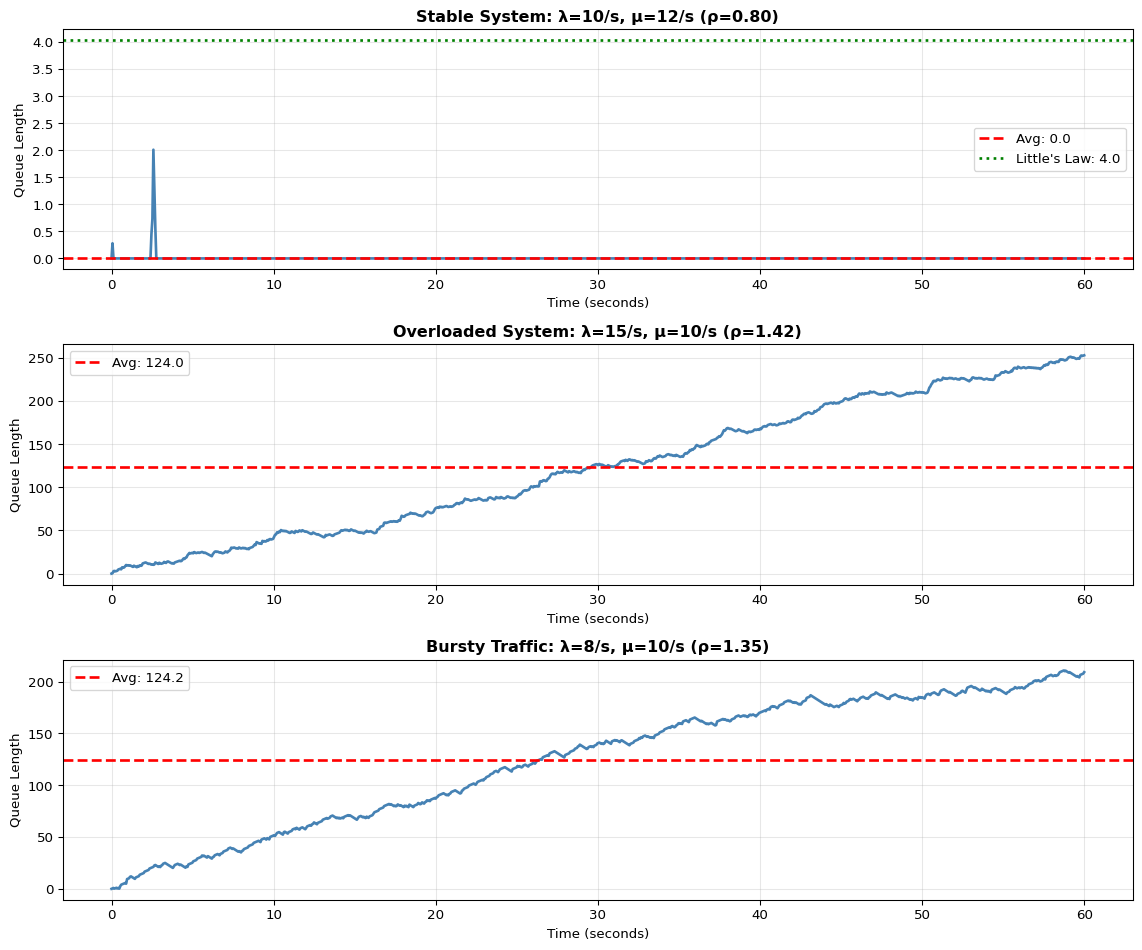 import numpy as npimport matplotlib.pyplot as pltfrom collections import dequeimport timedef littles_law_demo():""" Demonstrate Little's Law: L = λ × W where L = avg items in system λ = arrival rate W = avg time in system """print("="*70)print("Little's Law: L = λ × W")print("="*70) scenarios = [ {'name': 'Stable System','arrival_rate': 10, # samples/sec'service_rate': 12, # samples/sec'duration': 60 }, {'name': 'Overloaded System','arrival_rate': 15, # samples/sec'service_rate': 10, # samples/sec (slower than arrival!)'duration': 60 }, {'name': 'Bursty Traffic','arrival_rate': 8, # average'service_rate': 10,'duration': 60,'bursty': True } ] fig, axes = plt.subplots(len(scenarios), 1, figsize=(12, 10))for idx, scenario inenumerate(scenarios): ax = axes[idx]# Simulate arrivals and processing np.random.seed(42+ idx) duration = scenario['duration'] arrival_rate = scenario['arrival_rate'] service_rate = scenario['service_rate']# Generate arrival timesif scenario.get('bursty', False):# Bursty: cluster arrivals arrival_times = [] t =0while t < duration:# Burst or quiet periodif np.random.random() <0.3: # 30% chance of burst burst_size = np.random.randint(3, 8)for _ inrange(burst_size): arrival_times.append(t) t +=0.05# Rapid arrivalselse: t += np.random.exponential(1/ arrival_rate)if t < duration: arrival_times.append(t)else:# Poisson arrivals inter_arrival_times = np.random.exponential(1/ arrival_rate, int(duration * arrival_rate *2)) arrival_times = np.cumsum(inter_arrival_times) arrival_times = arrival_times[arrival_times < duration]# Simulate queue queue_length = [] timestamps = [] current_queue =0 last_service_time =0for t in np.linspace(0, duration, 1000):# Add arrivals up to time t arrivals_so_far = np.sum(np.array(arrival_times) <= t)# Process items based on service rate items_processed =min(service_rate * t, arrivals_so_far)# Queue length = arrivals - processed current_queue = arrivals_so_far - items_processed queue_length.append(current_queue) timestamps.append(t)# Calculate statistics avg_queue_length = np.mean(queue_length) max_queue_length = np.max(queue_length) actual_arrival_rate =len(arrival_times) / duration# Little's Law prediction utilization = actual_arrival_rate / service_rateif utilization <1: avg_wait_time =1/ (service_rate - actual_arrival_rate) predicted_queue = actual_arrival_rate * avg_wait_timeelse: predicted_queue =float('inf')# Plot ax.plot(timestamps, queue_length, linewidth=2, color='steelblue') ax.axhline(y=avg_queue_length, color='red', linestyle='--', label=f'Avg: {avg_queue_length:.1f}', linewidth=2)if utilization <1: ax.axhline(y=predicted_queue, color='green', linestyle=':', label=f"Little's Law: {predicted_queue:.1f}", linewidth=2) ax.set_title(f"{scenario['name']}: λ={arrival_rate}/s, μ={service_rate}/s "f"(ρ={utilization:.2f})", fontweight='bold') ax.set_xlabel('Time (seconds)') ax.set_ylabel('Queue Length') ax.legend() ax.grid(True, alpha=0.3)# Print statisticsprint(f"\n{scenario['name']}:")print(f" Arrival rate (λ): {actual_arrival_rate:.2f} items/sec")print(f" Service rate (μ): {service_rate:.2f} items/sec")print(f" Utilization (ρ): {utilization:.2f}")print(f" Avg queue length: {avg_queue_length:.2f}")print(f" Max queue length: {max_queue_length:.0f}")if utilization <1:print(f" Little's Law pred: {predicted_queue:.2f}")else:print(f" Status: UNSTABLE - Queue grows unbounded!") plt.tight_layout() plt.show()littles_law_demo()print("\n"+"="*70)print("Key Takeaways:")print("="*70)print("1. When λ < μ (arrival < service), queue remains bounded")print("2. When λ > μ, queue grows unbounded → system failure")print("3. Bursty traffic causes temporary queue spikes even when λ < μ")print("4. Always size buffers for peak load, not average load!")