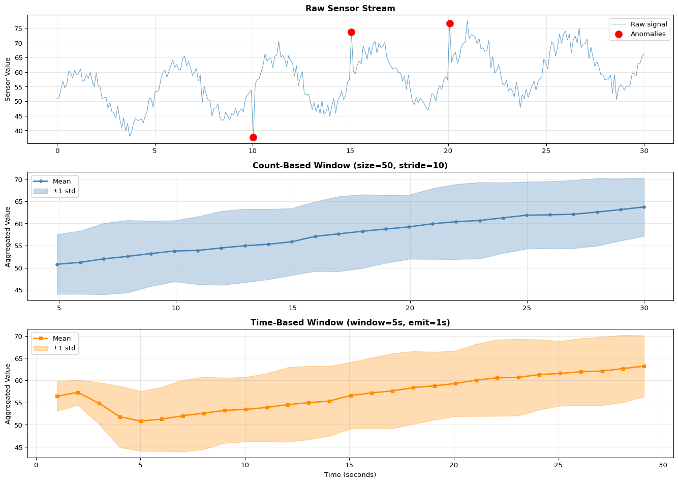 import numpy as npimport matplotlib.pyplot as pltfrom collections import dequeimport timeclass SlidingWindowCounter:"""Count-based sliding window"""def__init__(self, window_size, stride):self.window_size = window_sizeself.stride = strideself.buffer= deque(maxlen=window_size)self.samples_since_emit =0def add(self, sample):"""Add sample and return aggregated window if stride reached"""self.buffer.append(sample)self.samples_since_emit +=1iflen(self.buffer) ==self.window_size andself.samples_since_emit >=self.stride:self.samples_since_emit =0# Return window statistics window_array = np.array(self.buffer)return {'mean': np.mean(window_array),'std': np.std(window_array),'min': np.min(window_array),'max': np.max(window_array),'count': len(window_array) }returnNoneclass SlidingWindowTime:"""Time-based sliding window"""def__init__(self, window_seconds, emit_interval_seconds):self.window_seconds = window_secondsself.emit_interval = emit_interval_secondsself.buffer= deque()self.last_emit_time =Nonedef add(self, sample, timestamp):"""Add sample with timestamp"""self.buffer.append((timestamp, sample))# Remove samples outside window cutoff_time = timestamp -self.window_secondswhileself.bufferandself.buffer[0][0] < cutoff_time:self.buffer.popleft()# Check if time to emitifself.last_emit_time isNone:self.last_emit_time = timestampif timestamp -self.last_emit_time >=self.emit_interval:self.last_emit_time = timestamp# Compute statistics on current window values = [v for _, v inself.buffer]if values:return {'mean': np.mean(values),'std': np.std(values),'min': np.min(values),'max': np.max(values),'count': len(values),'window_seconds': self.window_seconds }returnNone# Demonstrate sliding windowsprint("="*70)print("Sliding Window Comparison")print("="*70)# Generate synthetic sensor streamnp.random.seed(42)duration =30# secondssample_rate =10# Hznum_samples = duration * sample_ratetimestamps = np.linspace(0, duration, num_samples)# Create signal with trend and noisesignal =50+0.5* timestamps +10* np.sin(2* np.pi *0.2* timestamps) +\ np.random.normal(0, 2, num_samples)# Add some anomaliesanomaly_indices = [100, 150, 200]for idx in anomaly_indices:if idx <len(signal): signal[idx] += np.random.choice([-15, 15])# Count-based windowwindow_count = SlidingWindowCounter(window_size=50, stride=10)count_results = []count_times = []for t, val inzip(timestamps, signal): result = window_count.add(val)if result: count_results.append(result) count_times.append(t)# Time-based windowwindow_time = SlidingWindowTime(window_seconds=5.0, emit_interval_seconds=1.0)time_results = []time_times = []for t, val inzip(timestamps, signal): result = window_time.add(val, t)if result: time_results.append(result) time_times.append(t)# Visualizefig, axes = plt.subplots(3, 1, figsize=(14, 10))# Raw signalaxes[0].plot(timestamps, signal, linewidth=0.8, alpha=0.7, label='Raw signal')axes[0].scatter([timestamps[i] for i in anomaly_indices if i <len(timestamps)], [signal[i] for i in anomaly_indices if i <len(signal)], color='red', s=100, zorder=5, label='Anomalies')axes[0].set_title('Raw Sensor Stream', fontweight='bold', fontsize=12)axes[0].set_ylabel('Sensor Value')axes[0].legend()axes[0].grid(True, alpha=0.3)# Count-based windowingif count_results: means = [r['mean'] for r in count_results] stds = [r['std'] for r in count_results] axes[1].plot(count_times, means, linewidth=2, marker='o', markersize=4, label='Mean', color='steelblue') axes[1].fill_between(count_times, np.array(means) - np.array(stds), np.array(means) + np.array(stds), alpha=0.3, color='steelblue', label='±1 std') axes[1].set_title('Count-Based Window (size=50, stride=10)', fontweight='bold', fontsize=12) axes[1].set_ylabel('Aggregated Value') axes[1].legend() axes[1].grid(True, alpha=0.3)print(f"\nCount-Based Window:")print(f" Window size: 50 samples (5 seconds at 10 Hz)")print(f" Stride: 10 samples")print(f" Overlap: {(50-10)/50*100:.0f}%")print(f" Output rate: {len(count_results) / duration:.1f} results/sec")print(f" Data reduction: {len(signal) /len(count_results):.1f}x")# Time-based windowingif time_results: means = [r['mean'] for r in time_results] stds = [r['std'] for r in time_results] axes[2].plot(time_times, means, linewidth=2, marker='s', markersize=4, label='Mean', color='darkorange') axes[2].fill_between(time_times, np.array(means) - np.array(stds), np.array(means) + np.array(stds), alpha=0.3, color='darkorange', label='±1 std') axes[2].set_title('Time-Based Window (window=5s, emit=1s)', fontweight='bold', fontsize=12) axes[2].set_xlabel('Time (seconds)') axes[2].set_ylabel('Aggregated Value') axes[2].legend() axes[2].grid(True, alpha=0.3)print(f"\nTime-Based Window:")print(f" Window duration: 5 seconds")print(f" Emit interval: 1 second")print(f" Output rate: {len(time_results) / duration:.1f} results/sec")print(f" Avg samples/window: {np.mean([r['count'] for r in time_results]):.1f}")print(f" Data reduction: {len(signal) /len(time_results):.1f}x")plt.tight_layout()plt.show()
