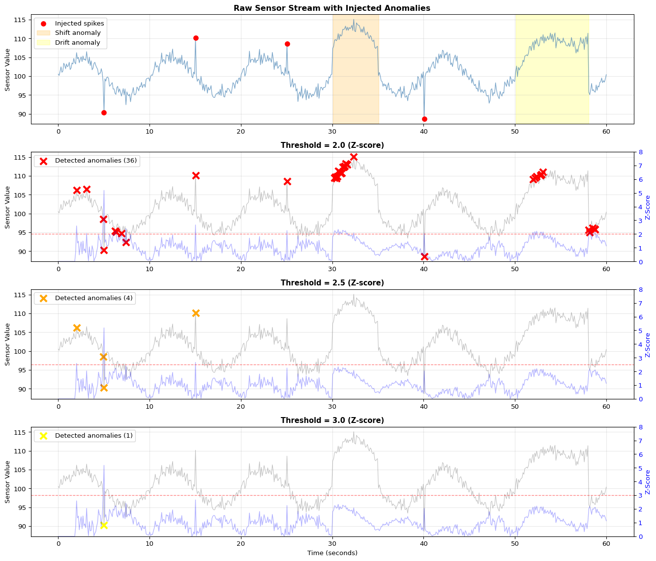 These interactive Python examples demonstrate stream processing concepts. Run them to understand windowing, buffering, and anomaly detection before implementing real sensor pipelines.