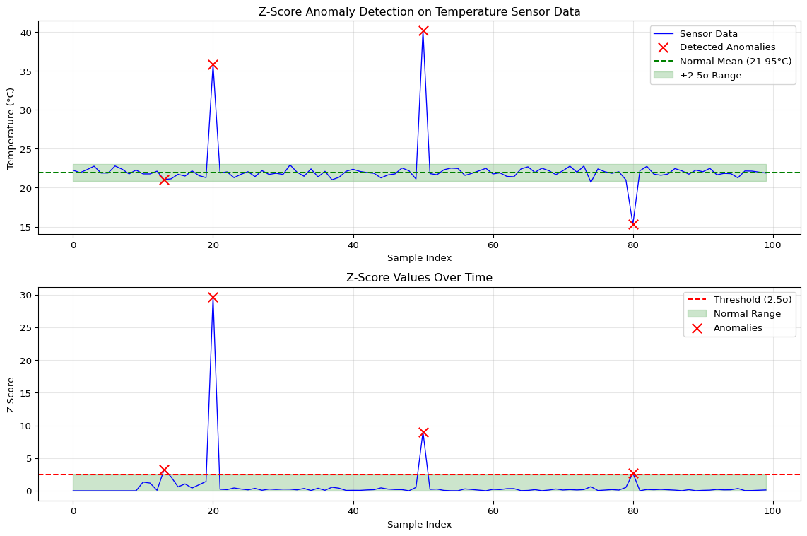 constint WINDOW_SIZE =50;constfloat THRESHOLD =2.5;float buffer[WINDOW_SIZE];int bufferIndex =0;int bufferCount =0;float runningSum =0;float runningSumSq =0;bool detectAnomaly(float value){// Calculate mean and std from running sumsfloat mean = runningSum / max(bufferCount,1);float variance =(runningSumSq / bufferCount)-(mean * mean);float std = sqrt(max(variance,0.0001));float z = abs(value - mean)/ std;bool isAnomaly =(bufferCount >=10)&&(z > THRESHOLD);// Only update with normal valuesif(!isAnomaly){if(bufferCount == WINDOW_SIZE){ runningSum -= buffer[bufferIndex]; runningSumSq -= buffer[bufferIndex]* buffer[bufferIndex];}else bufferCount++; runningSum += value; runningSumSq += value * value; buffer[bufferIndex]= value; bufferIndex =(bufferIndex +1)% WINDOW_SIZE;}return isAnomaly;}