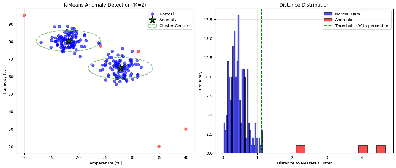 K-Means Clustering (~10KB memory, ~5ms latency): Finds K clusters in training data representing different “normal” operating modes (e.g., day/night, different load levels). Points far from all cluster centers are anomalies. Suitable for multi-dimensional data with multiple normal modes on ESP32 or Pi devices.