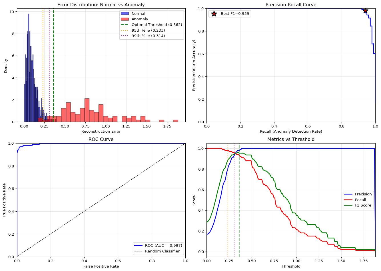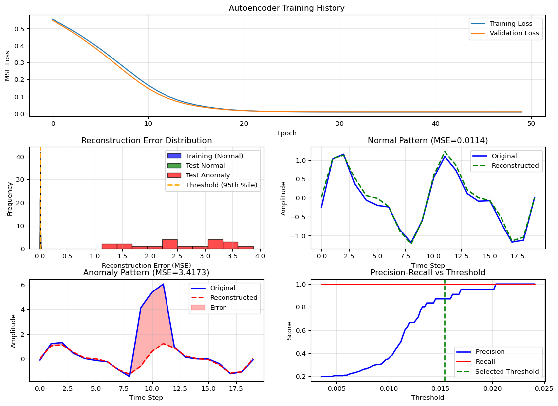 Critical rule: always train on normal data only. If you include anomalies in training, the model learns to reconstruct them, defeating the purpose. After training, set a threshold using the 95th-99th percentile of reconstruction error on normal validation data. This gives a baseline false positive rate of 1-5%.